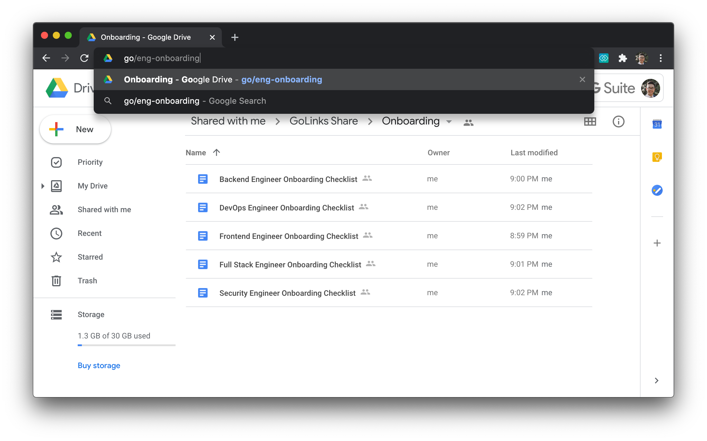 • Easy for employees to remember and share with others - Of course, colleagues do occasionally need to ask each other for help with finding things. The great thing about using golinks is that when an employee gets asked where something is, they’re more likely to remember it and can simply share the golink, rather than pulling up the long Google Drive link.
